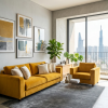Kết hợp với tường trắng và tranh nghệ thuật tông vàng nổi tạo điểm nhấn