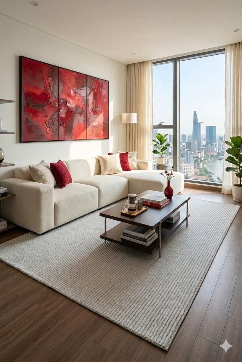 Kết hợp với tường trắng và tranh nghệ thuật màu đỏ nổi tạo điểm nhấn